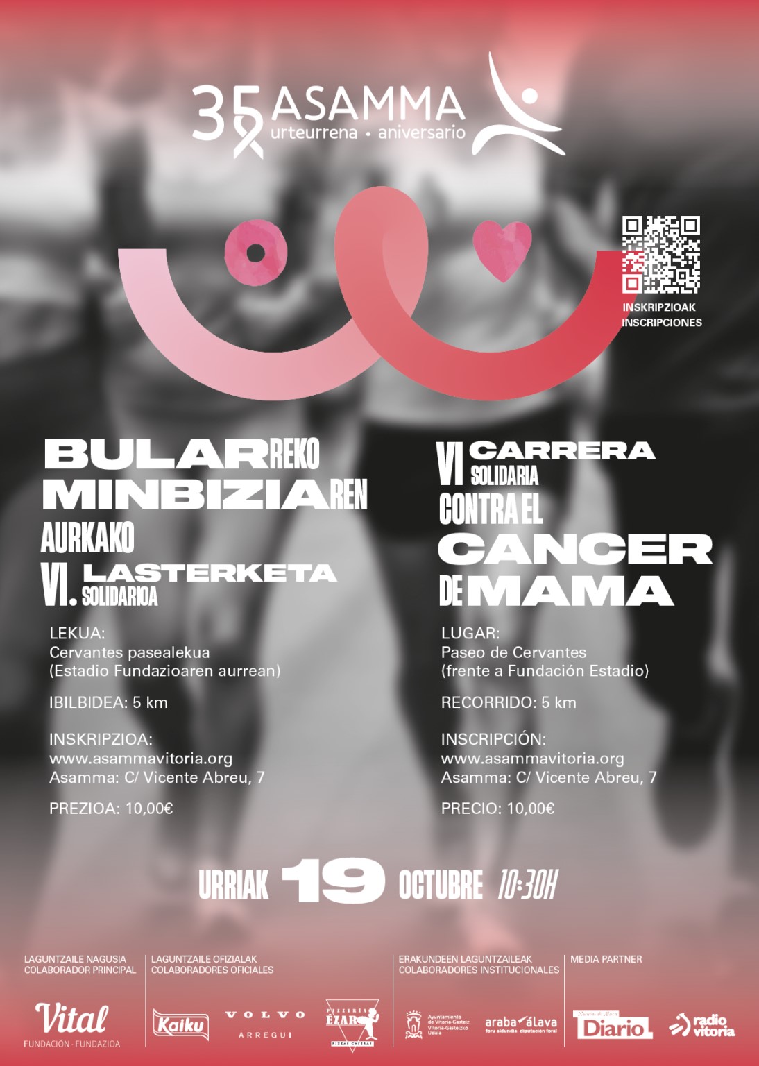 El Sindicato de Enfermería y Fisioterapia SATSE participa en la VI Carrera Solidaria contra el Cáncer de Mama y/o Ginecológico ASAMMA que se celebrará el próximo 19 de octubre en Vitoria-Gasteiz. Carrera de 5km desde el paseo cervantes de Vitoria a las 10.30 de la mañana.